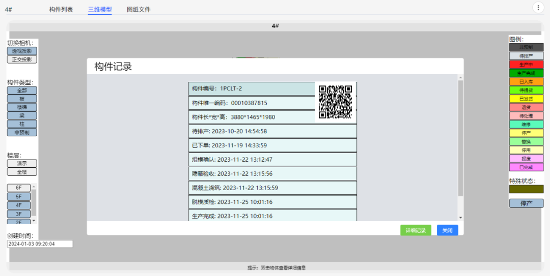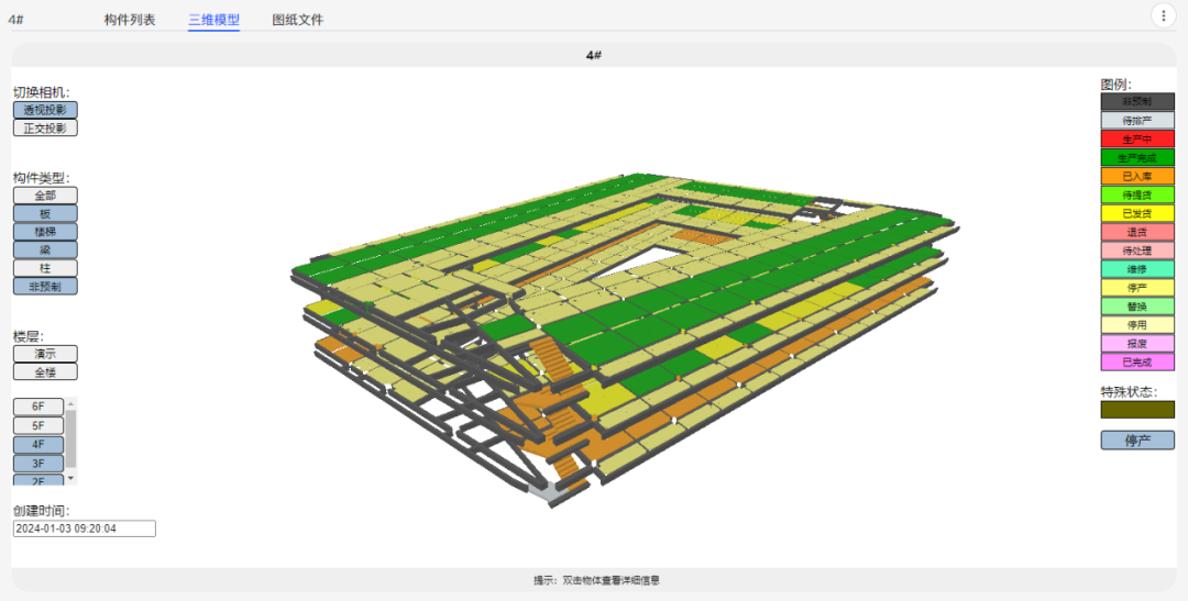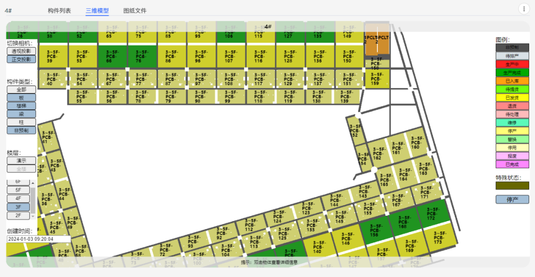 用戶可以在任意自由視角下查看樓棟模型,包括樓層切換顯示、不同構(gòu)件類型切換顯示等。也可以在三維模型中查看單個構(gòu)件的基本生產(chǎn)情況。